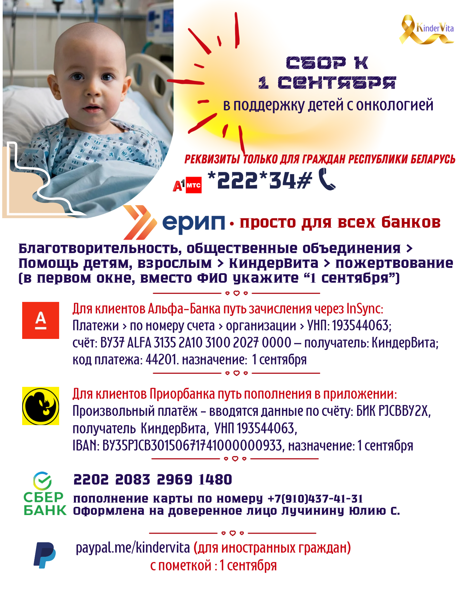 Мы знаем, что у нас много благотворителей, которые традиционно в конце лета помогали онкодетям. Если вы из их числа и хотите сделать доброе дело, пожалуйста, поучаствуйте в сборе (реквизиты - на фото). Поддержите инициативу индивидуальным пожертвованием или соберитесь с друзьями, соратниками или коллегами.